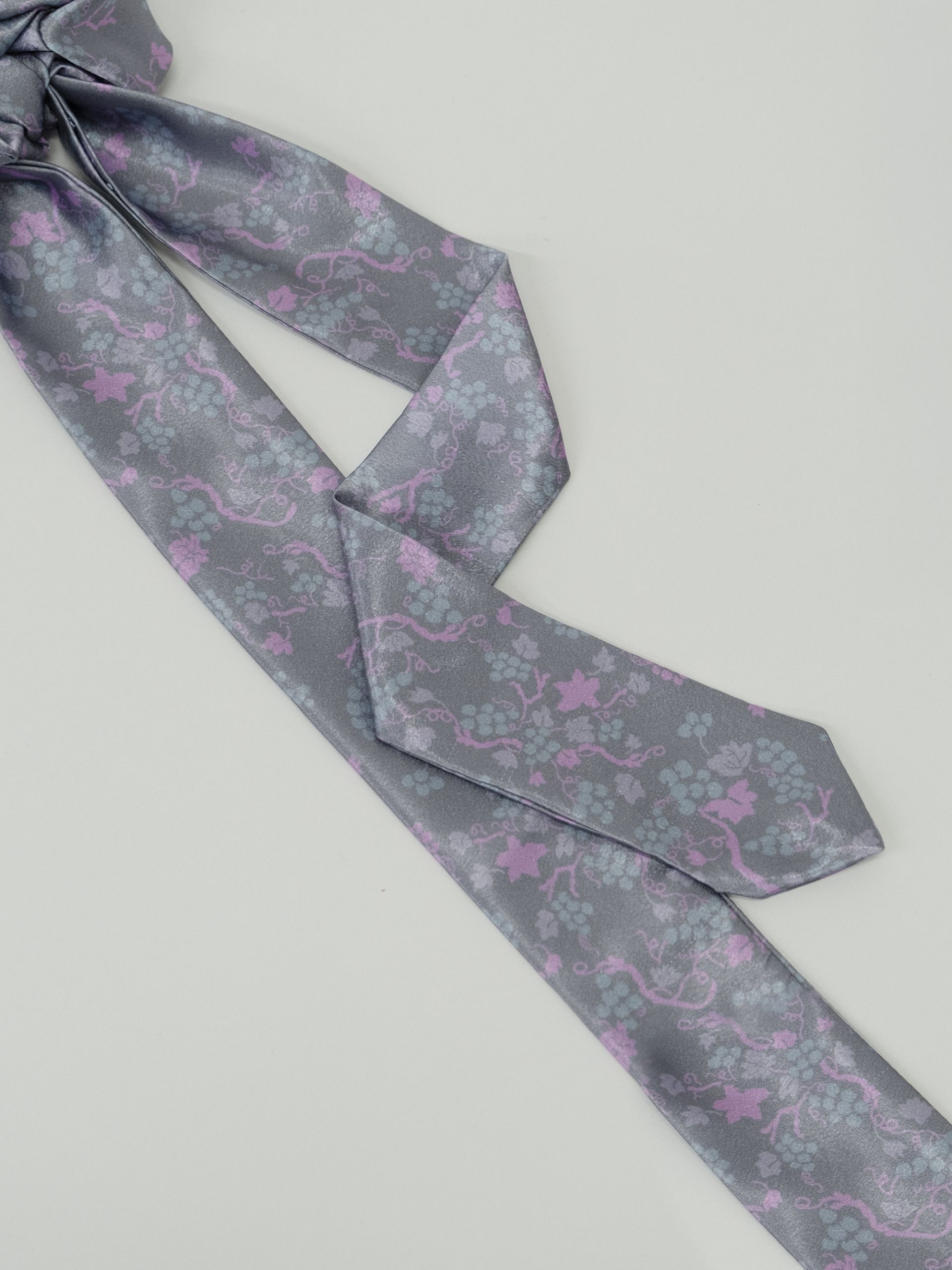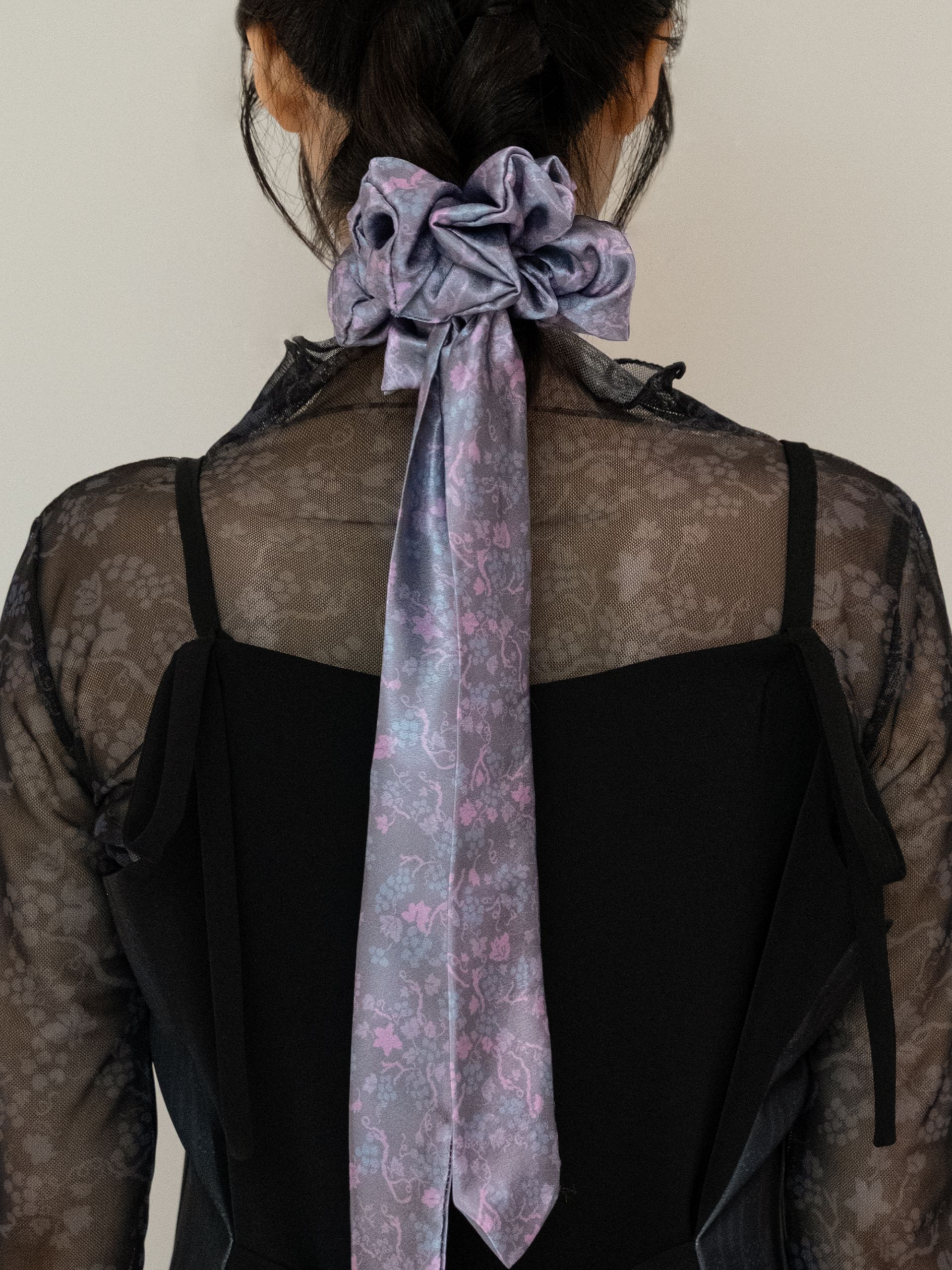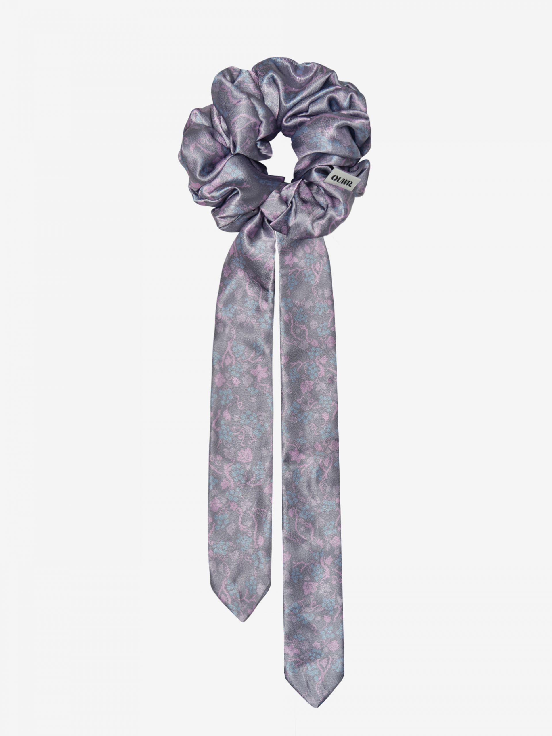 - 은은한 광택이 고급스러운 공단 소재에 오우르 P17 포도패밀리 패턴을 덧입힌 댕기 스크런치입니다.