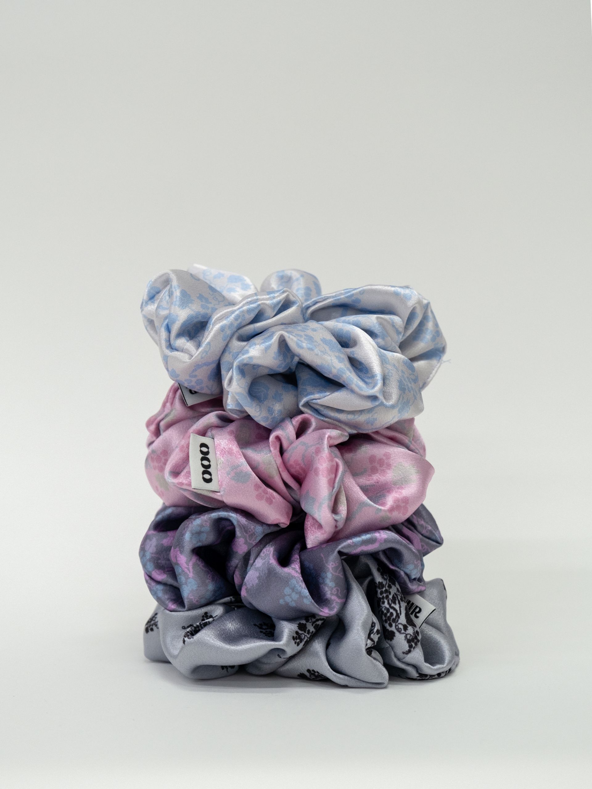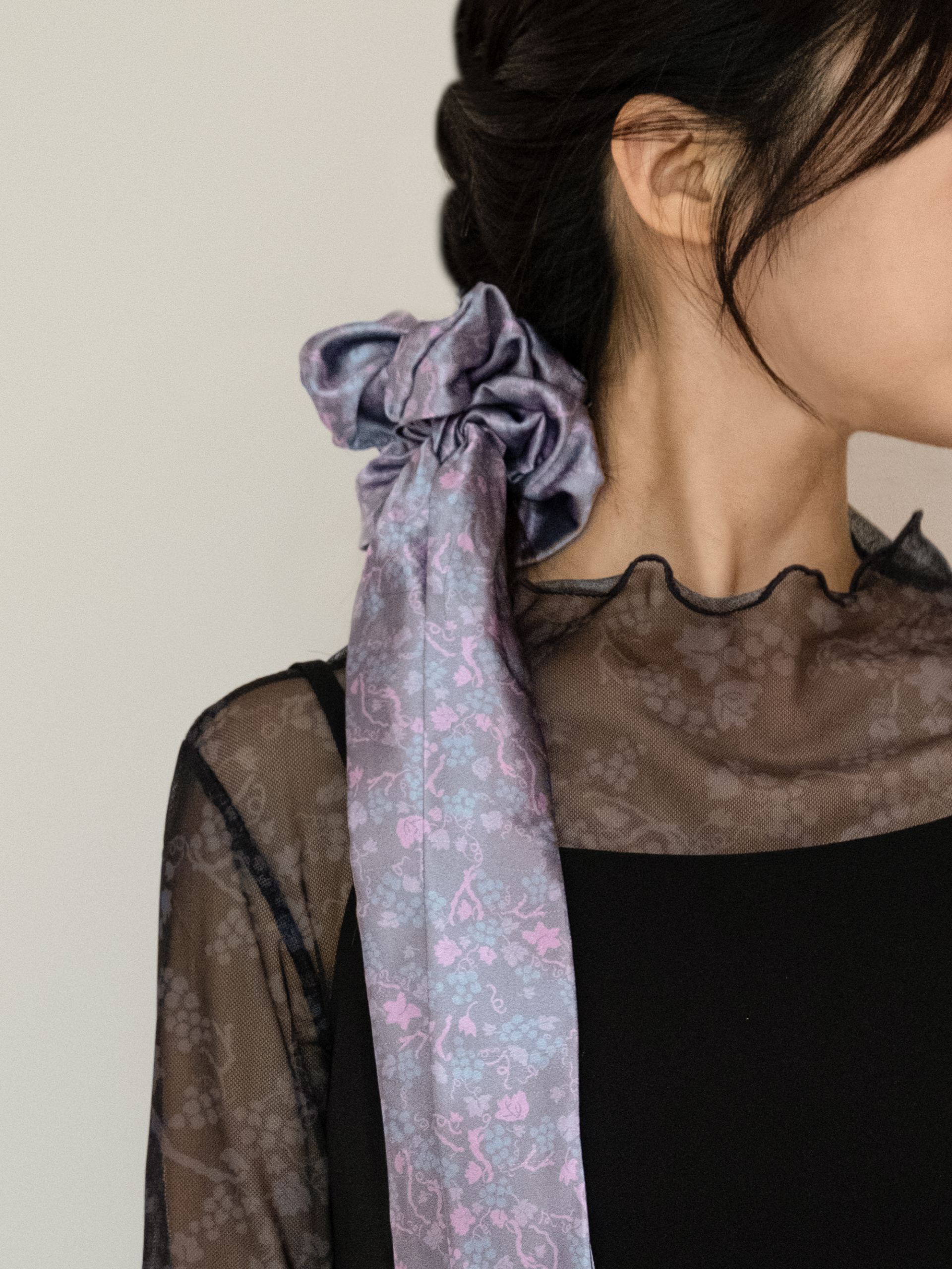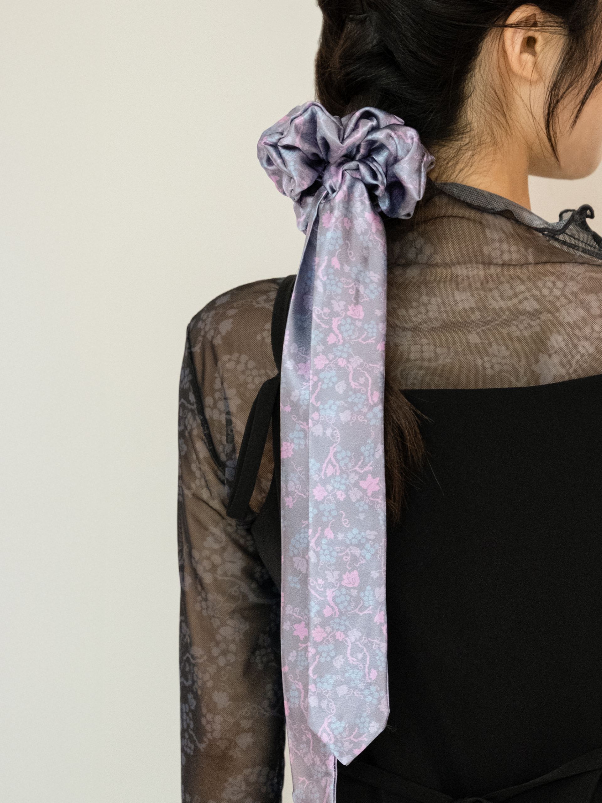- 은은한 광택이 고급스러운 공단 소재에 오우르 P17 포도패밀리 패턴을 덧입힌 댕기 스크런치입니다.