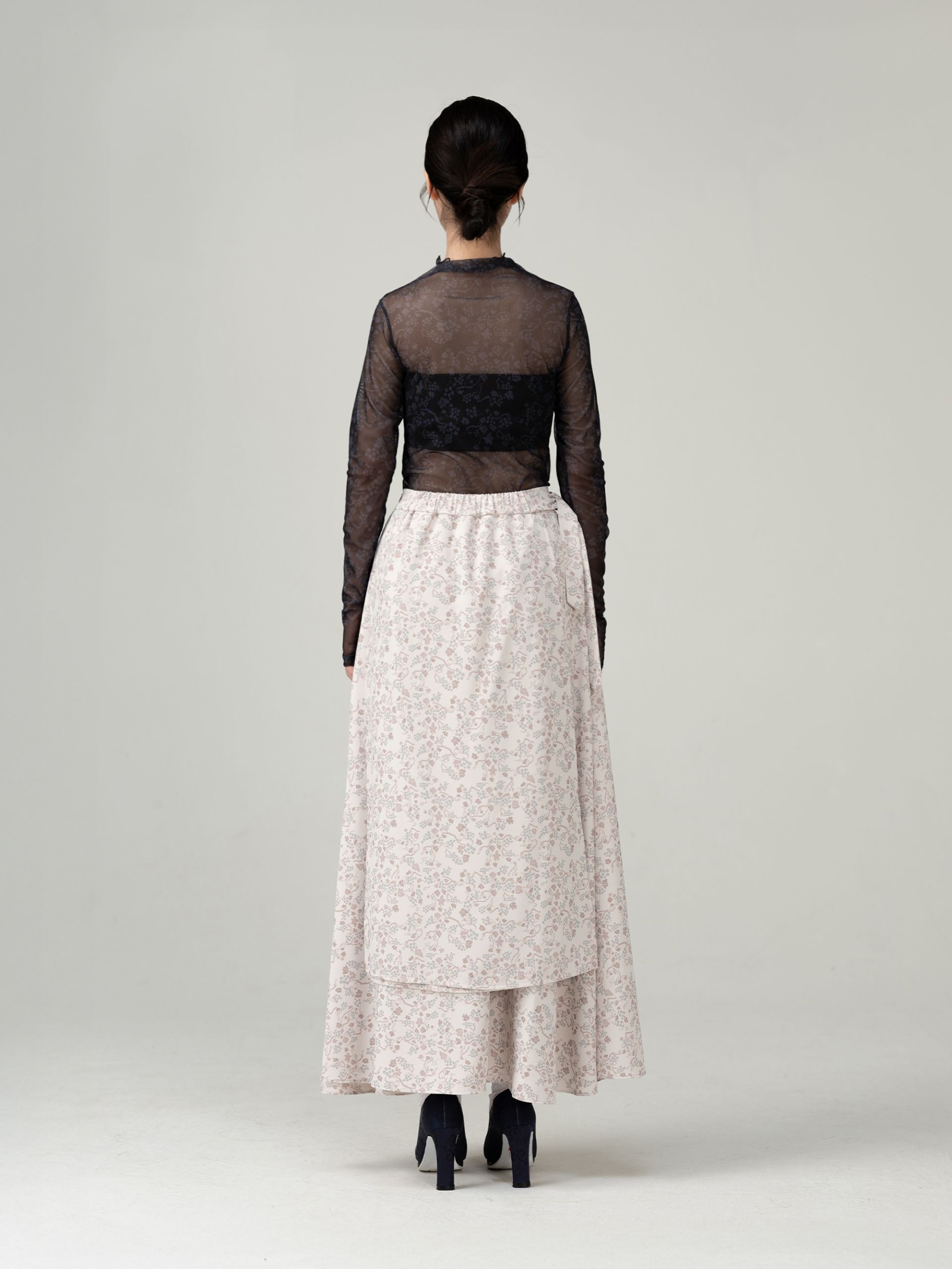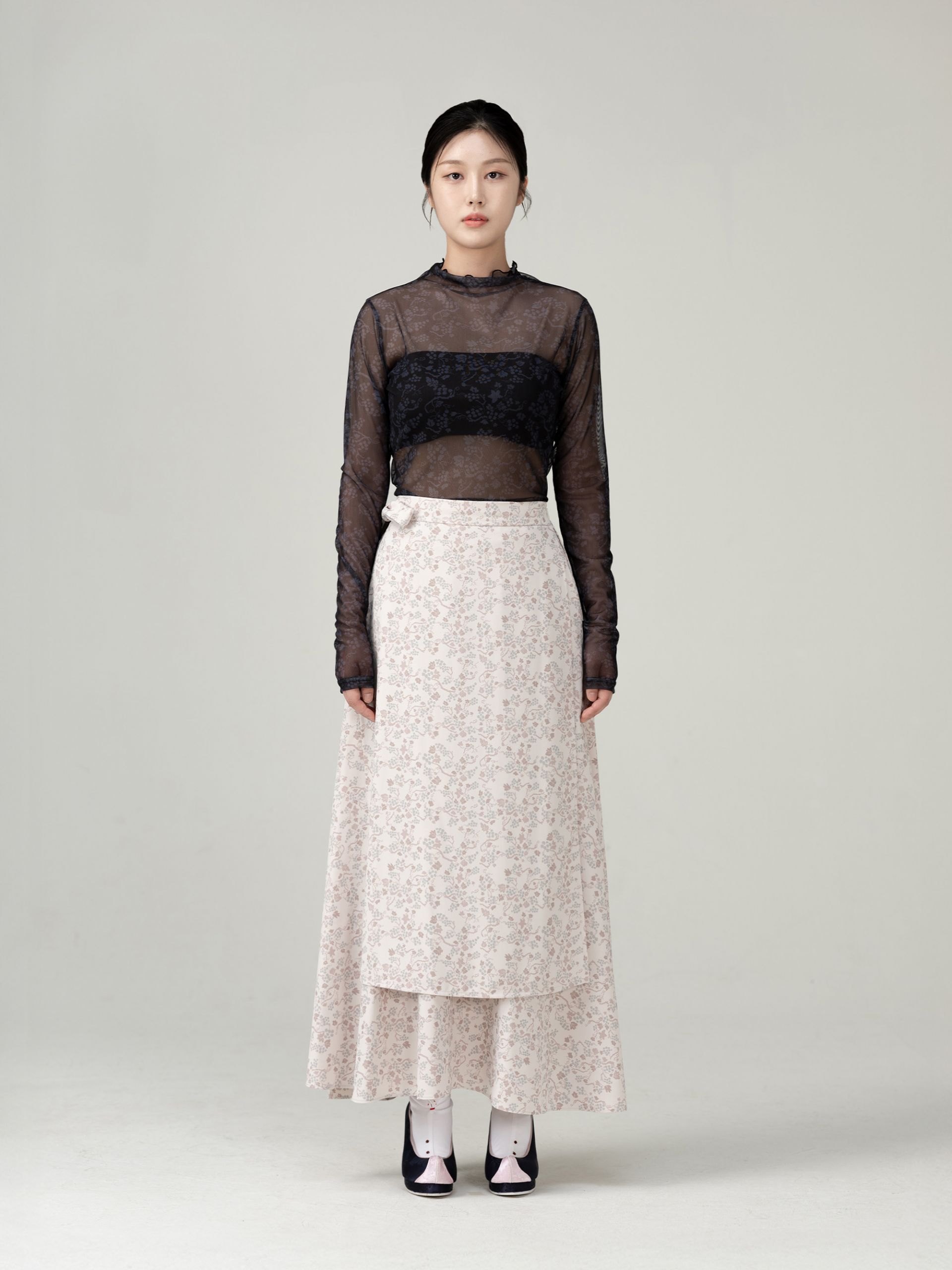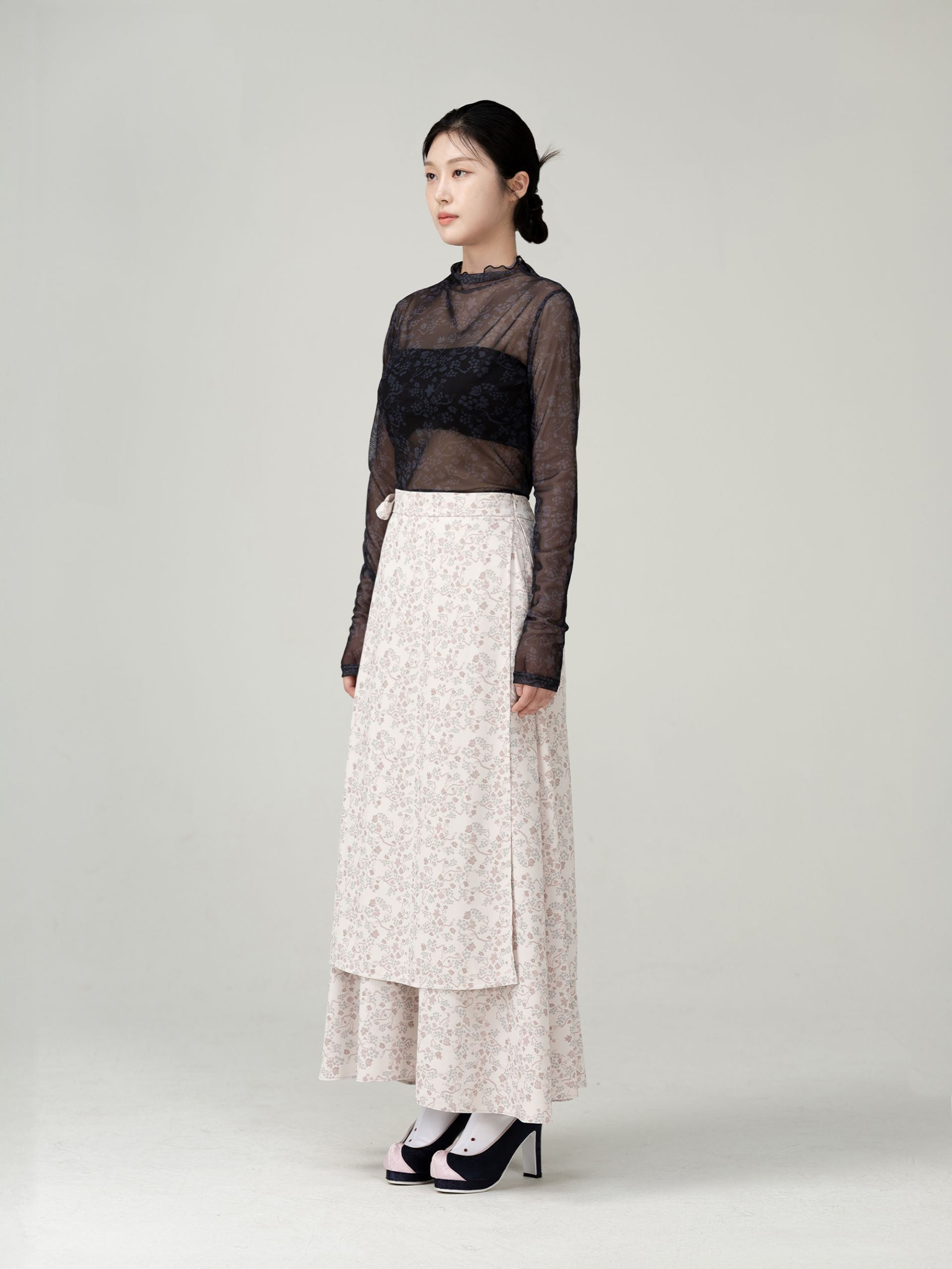- 3폭을 이어 만든 홑겹의 형태로, 움직임에 따라 나풀거리는 모습이 특징인 이 스커트는 뒷밴딩이 있어 사이즈의 구애없이 다양하게 착용 가능합니다.