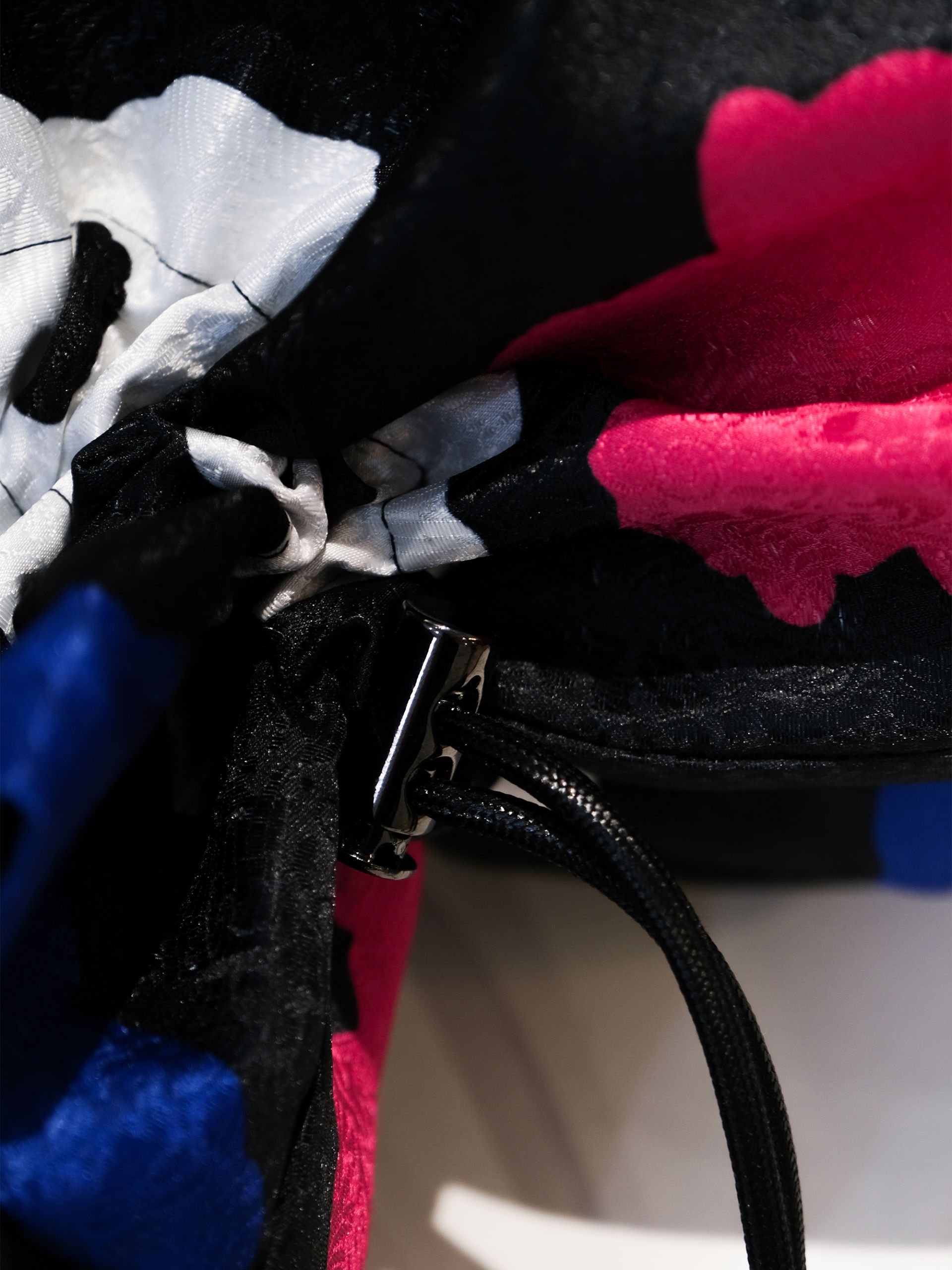 - 은은한 광택이 고급스러운 양단 소재에 오우르 패턴을 입힌 복주머니 미니백입니다.