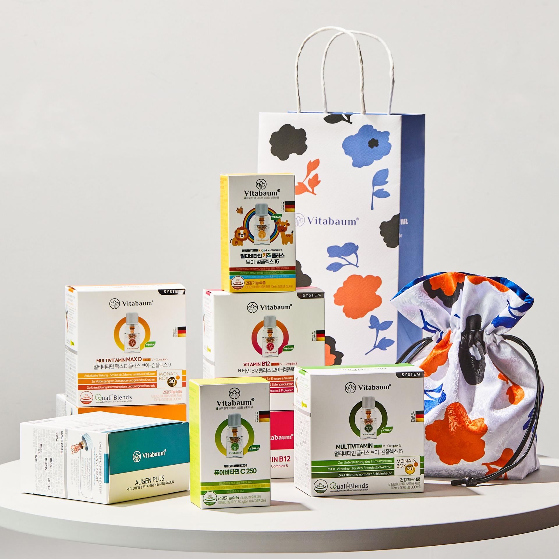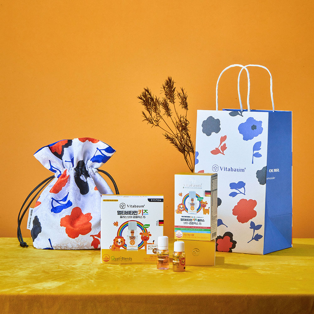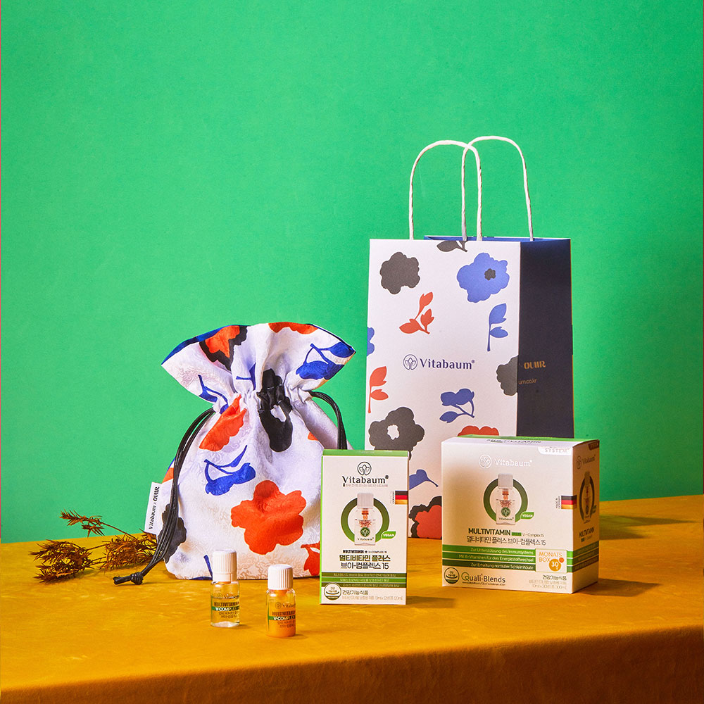 독일 프리미엄 비타민에 담긴 건강을 한국 전통의 아름다움을 선보이는 오우르의 복에 담아드리는 특별한 추석 선물세트입니다.오우르의 시그니처 구름꽃 패턴에 비타바움만의 브랜드 컬러를 입힌 복주머니 파우치와 쇼핑백을 제작했습니다.
